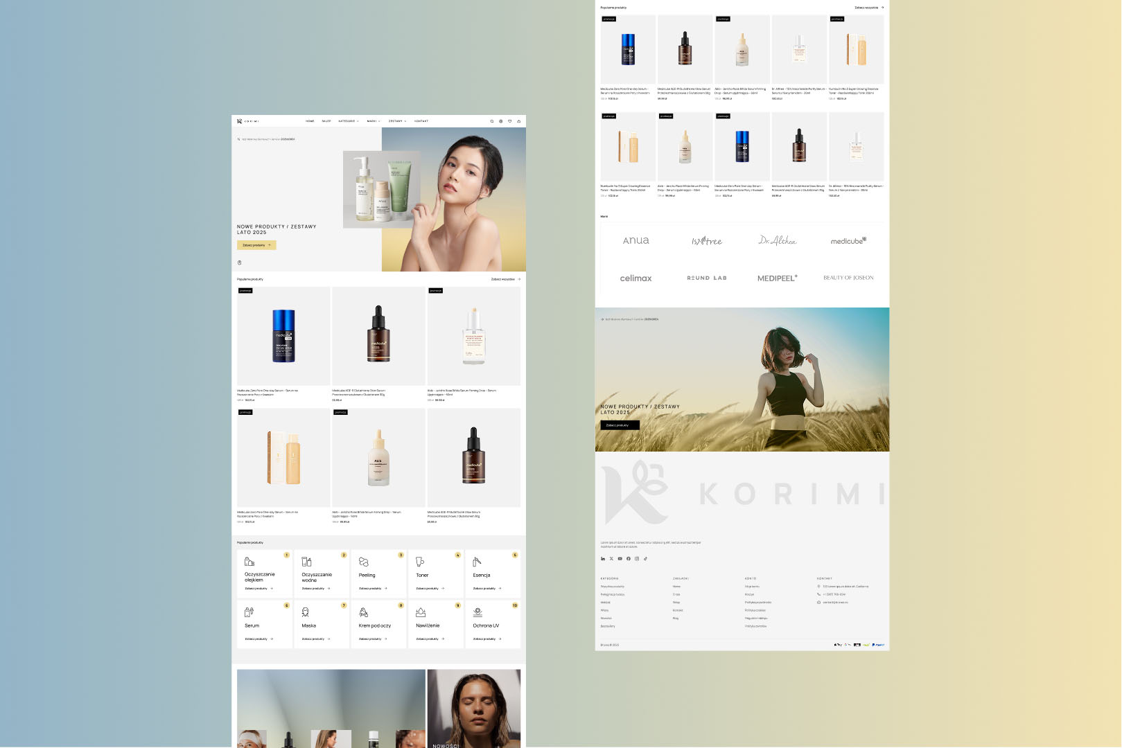 At the design stage, we focused on creating a unique look for the store, reflecting the character of the Korimi brand and the K-Beauty aesthetic. We prepared a modern graphic design in Figma - from initial UX sketches to refined UI interfaces - taking care to be consistent with the corporate identity and user experience. We planned the layout of the site so that navigation through categories and products is intuitive, and key elements (search engine, shopping cart, promotions) are always easily accessible.